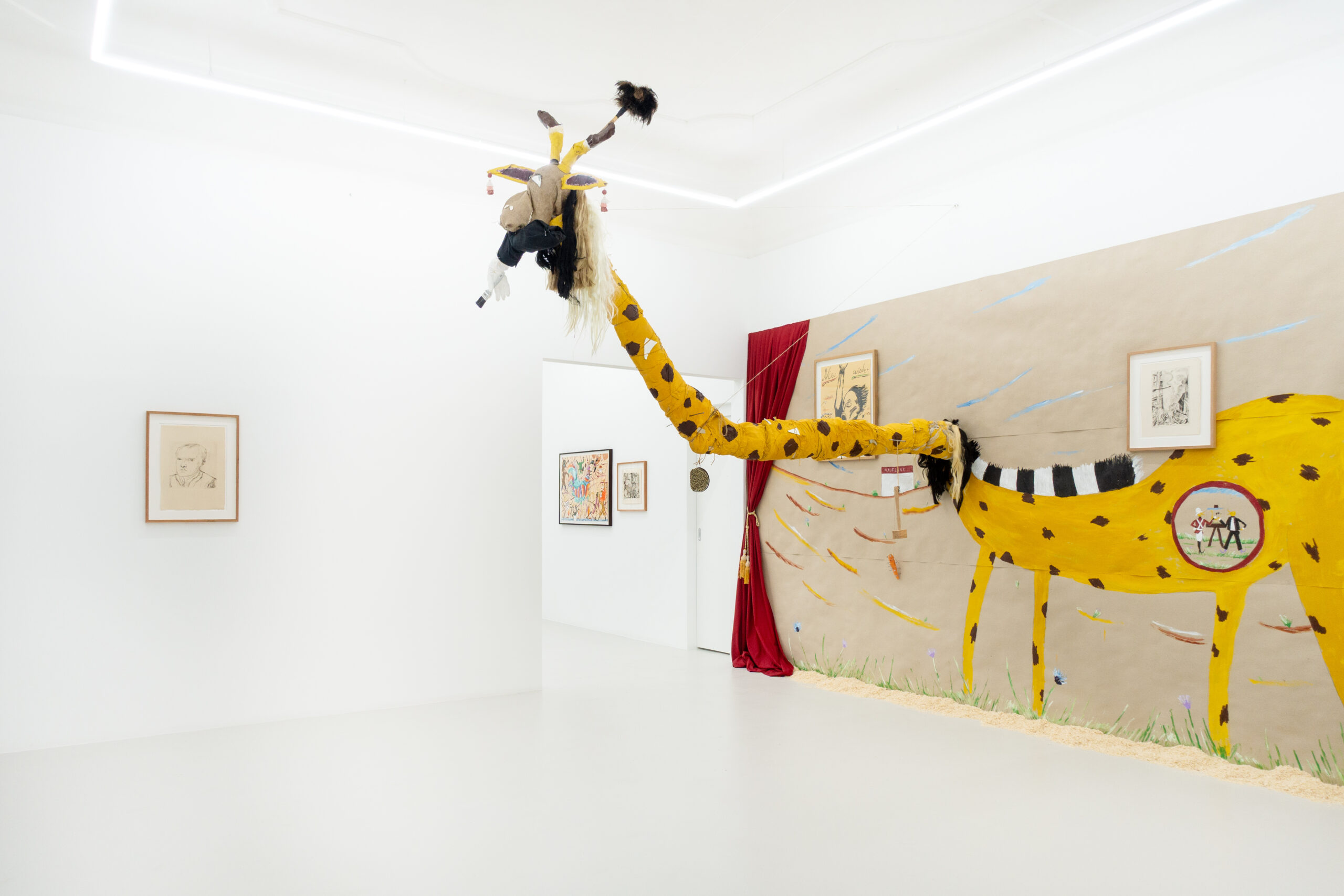 Aus der Wand wächst der Hals einer Giraffe – groteske Jagdtrophäe und zentrales Objekt der Ausstellung. Käthe Kollwitz’ Giraffe ist kein harmloses Tier, sondern groß genug, um Max Beckmann und Andrew Gilbert selbst zu verschlingen. Eine Giraffe im Originalmaßstab, so gefräßig, dass ihr Hals gestützt werden muss.